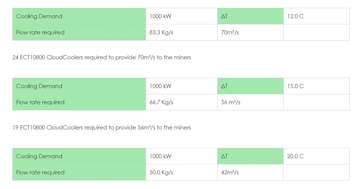 In the last example 14 ECT10800 CloudCoolers required to provide cooling for 1MW of miners.